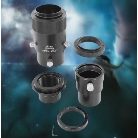 The upgraded VEPA Plus adapter can hold eyepieces up to 42mm in upper body diameter. It features a laser engraved extension scale for recordability and repeatability as well as a large machined grip ring for a sure grip in the worst dew conditions. CNC machined of aluminum with a durable black anodized finish. The 1.25" barrel is threaded to accept standard 1.25" Eyepiece Filters. See our optional clear glass Dust Filter (#T1FLT), recommended to help keep dust out of your camera.