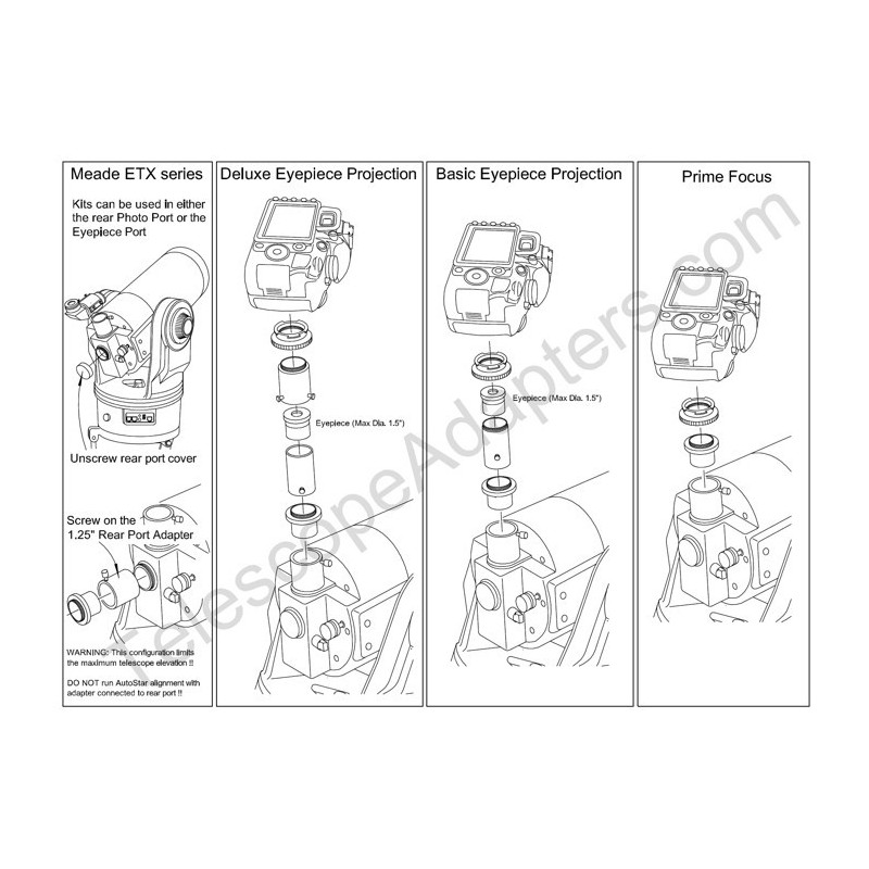 The worlds most versatile ETX Adapter Set. The included parts will allow you to couple your camera to both the ETX Photo port and the Top Eyepiece port. You can Image in both Prime Focus or Eyepiece Projection modes to cover the full magnification range of the ETX. Fits ETX 90/105/125. Also Celestron NexStar 4.