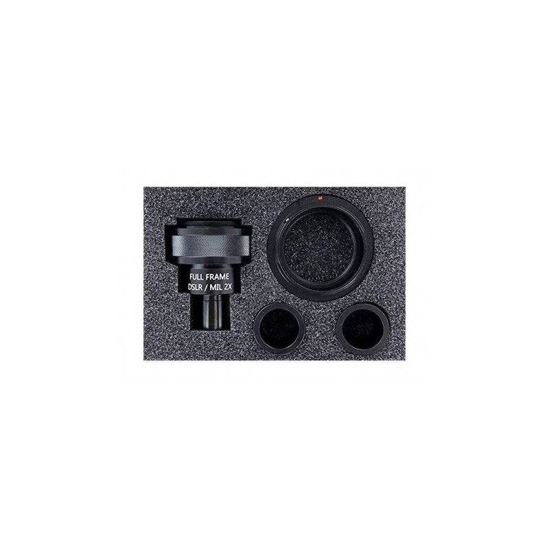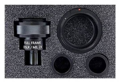 This Fixed Magnification Microscope Camera adapter set works with all DSLR & Mirrorless Cameras and will fit most popular Ocular ports. The 2X magnification can even handle Full Frame sensors without Vignetting. High quality Fully Multi-coated optics with blackened edges produce high contrast images. Directly fits 23mm Ocular and Trinocular Ports. Includes adapter sleeves for other common Ocular Ports (30mm and 30.5mm). Will not fit threaded C-Mounts. One Camera Ring is included, additional rings for other cameras are available (see our T-Rings page).