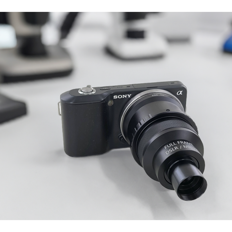This Fixed Magnification Camera adapter set works with all Sony E Mount (NEX/A7/QX/VG) Cameras and will fit most popular Ocular ports. The 2X magnification can even handle Full Frame sensors without Vignetting. Directly fits 23mm Ocular and Trinocular Ports.